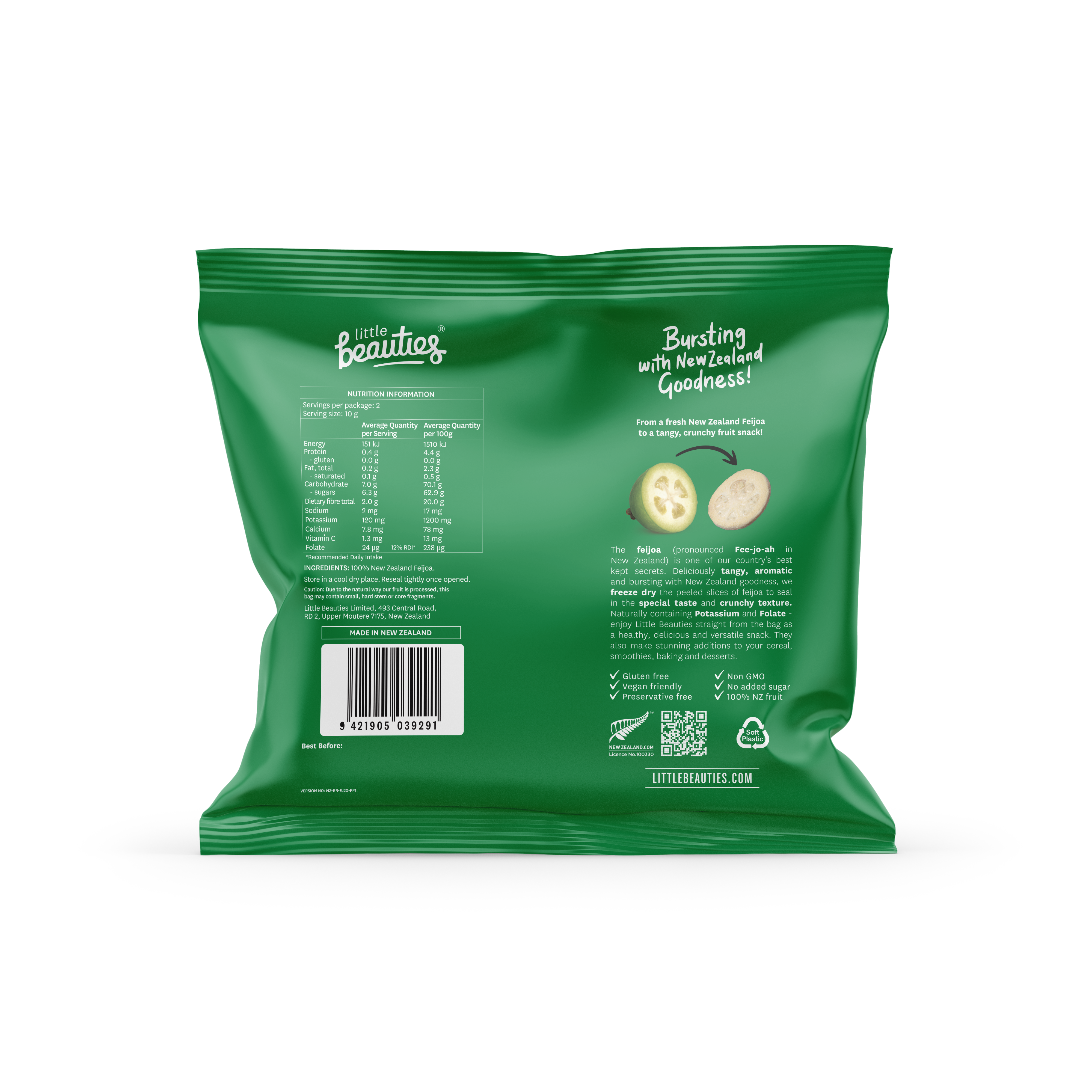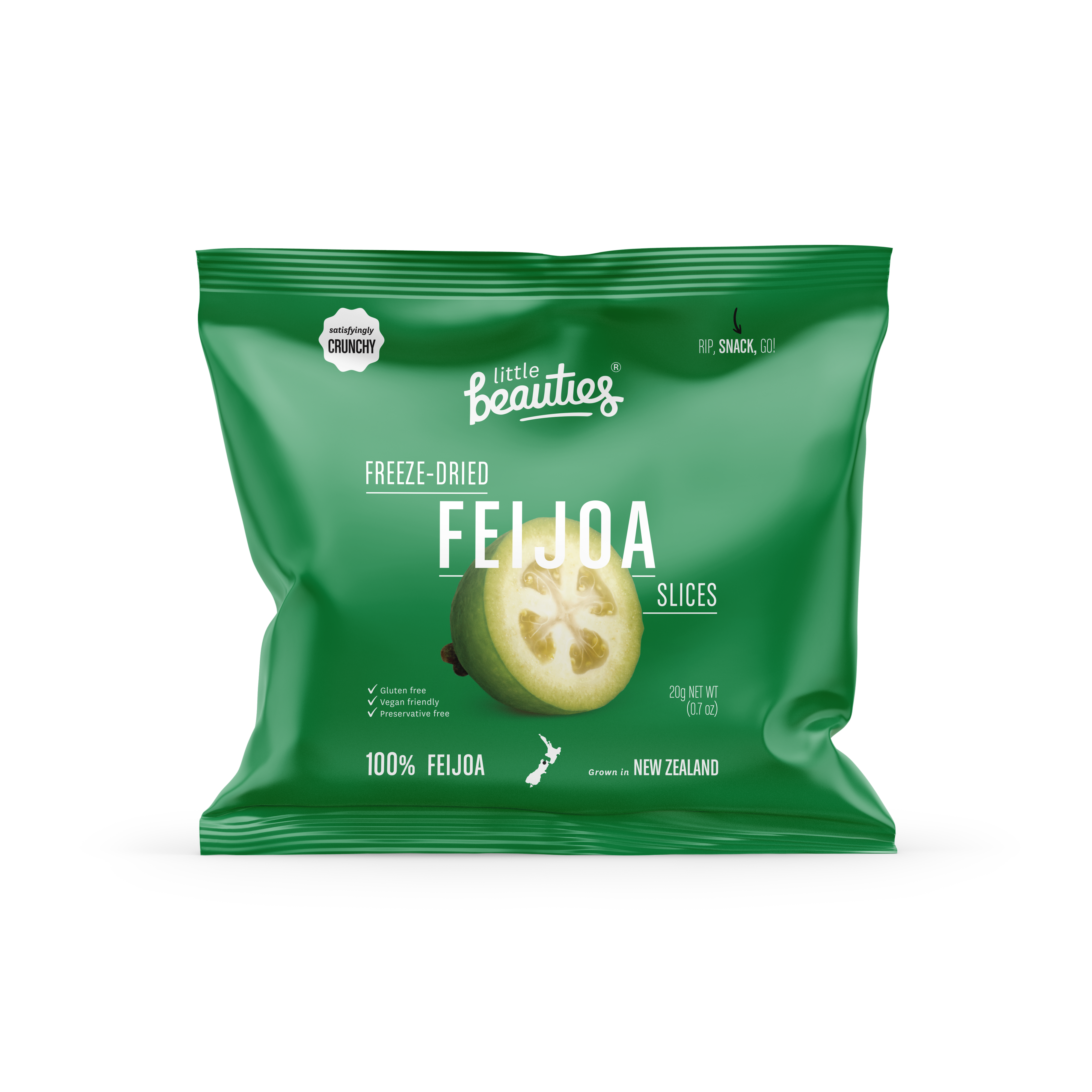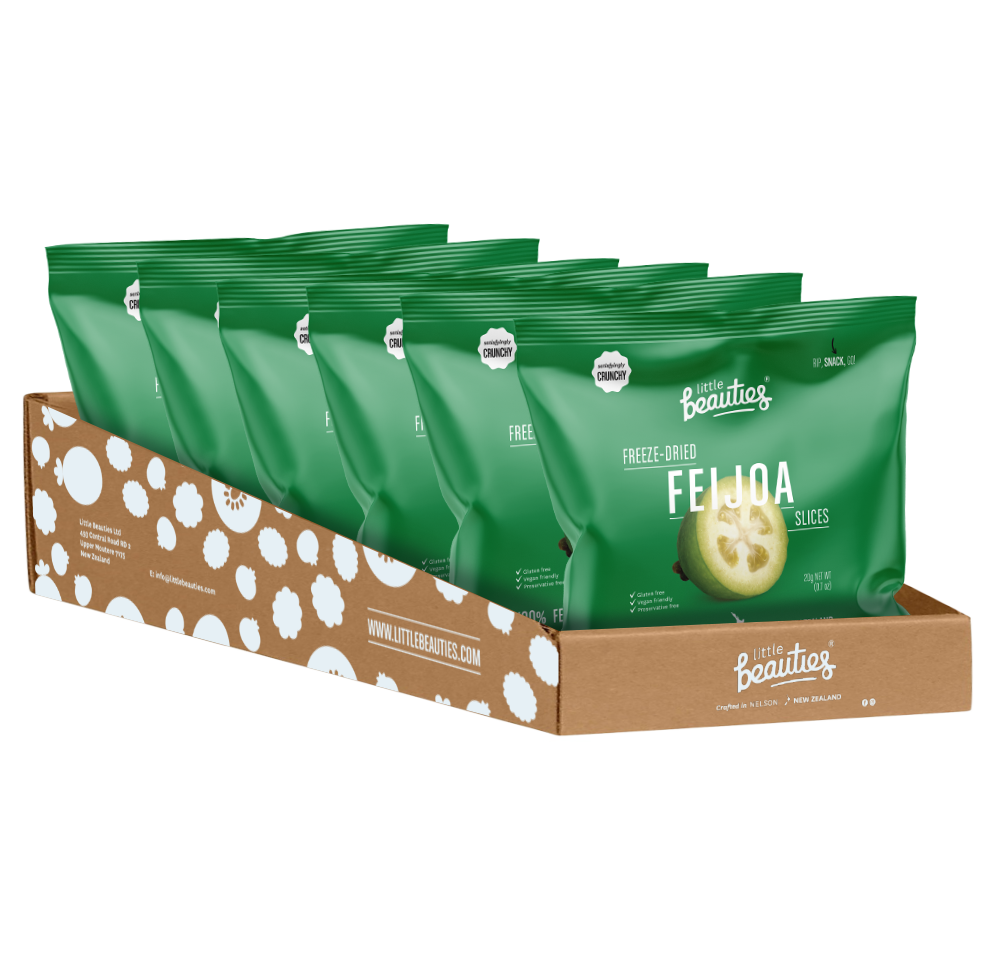 Little Beauties Feijoa Slices are peeled and freeze-dried to concentrate that delicious flavour and create a crunchy texture.